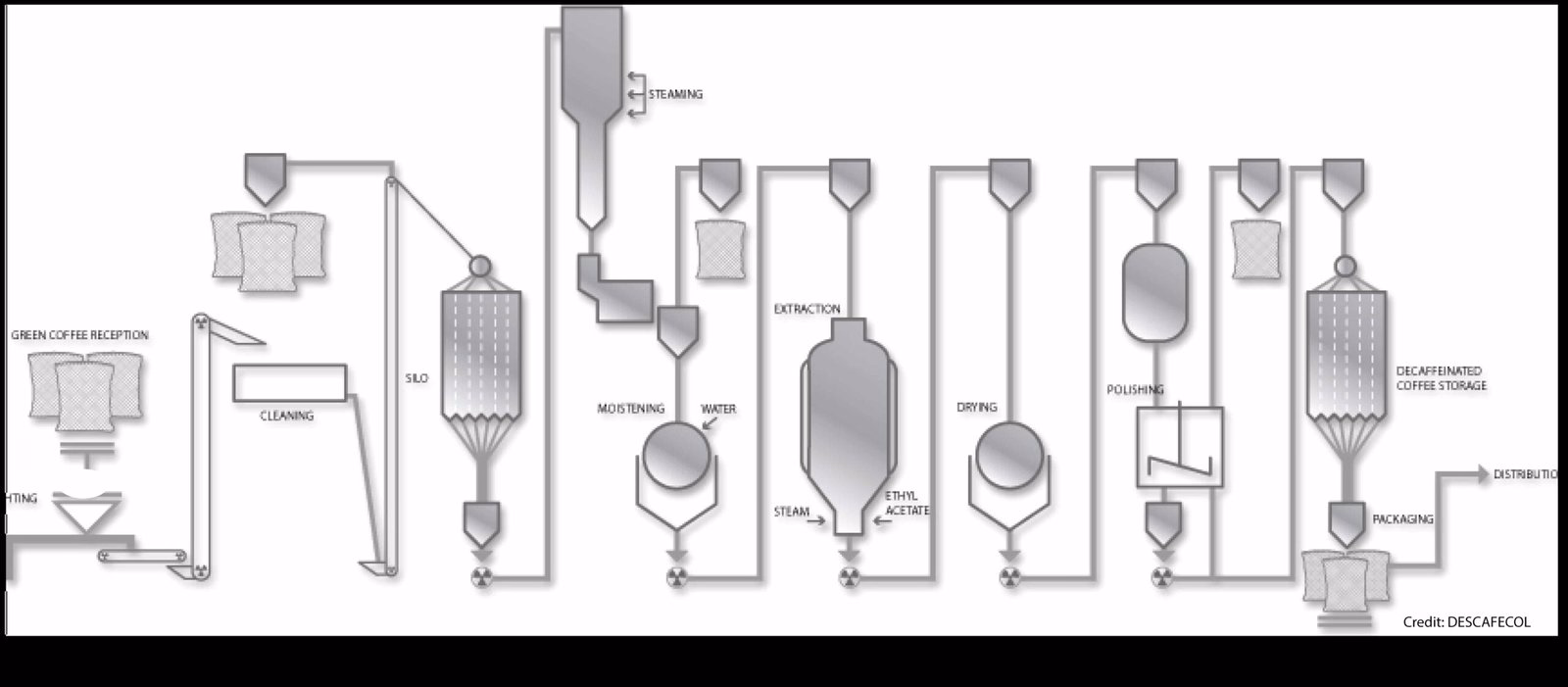 This coffee is produced by selected farms in the Popayan region. The coffee is milled in Popayan and transported to Caldas to be decaffeinated.