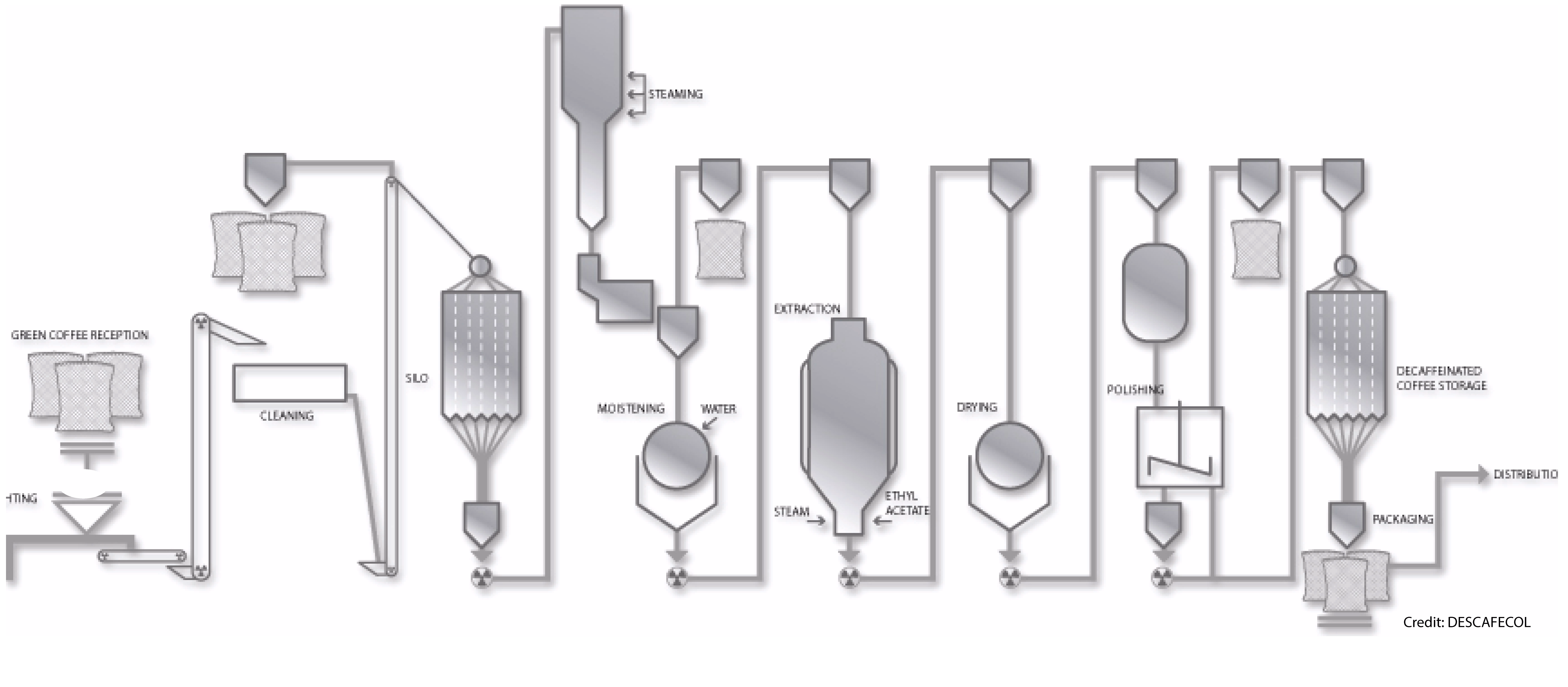 The actual process requires the coffee to be first 'steamed' to open up its pores. Next, the E.A. is applied via water, which dissolves the caffeine in the green coffee. Then the caffeine is separated and filtered from the tank. Finally, the now-decaffeinated seeds are steamed again to remove any residual E.A. before being dried and shipped. This method avoids excessive heat or pressure, which can radically disrupt green coffees cellular structure.