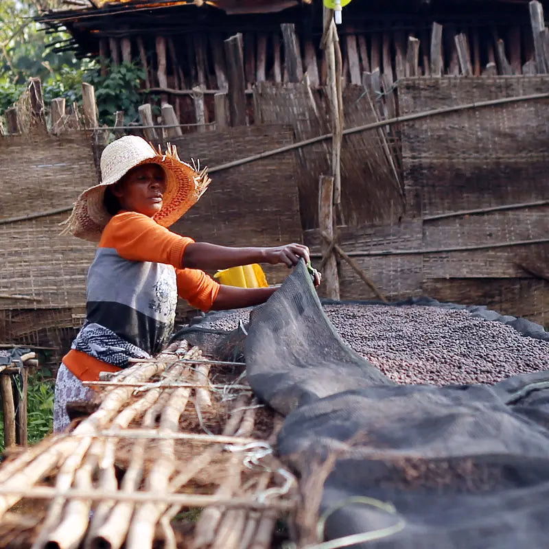 This process takes a much longer time than washed processing, Time varies depending on humidity, temperature and amount of sunlight. Cherries are dried on African raised beds for proper airflow and the coffee itself must be frequently turned. When the desired moisture content is achieved (14 to 21 days depending on the weather), the dried cherries are milled and stored.