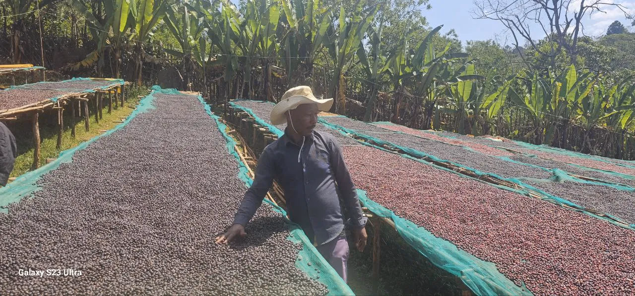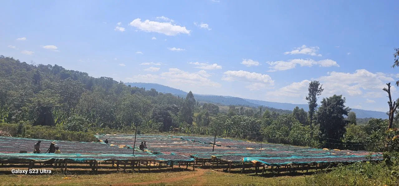 Processing this coffee naturally—with cherries handpicked, hand-sorted, and sun-dried on raised beds, shaded for up to 25 days—reinforces its quality-forward profile. This labour-intensive drying allows fermentation in the intact fruit, leading to bold, syrupy body, jammy fruit notes and enhanced sweetness.