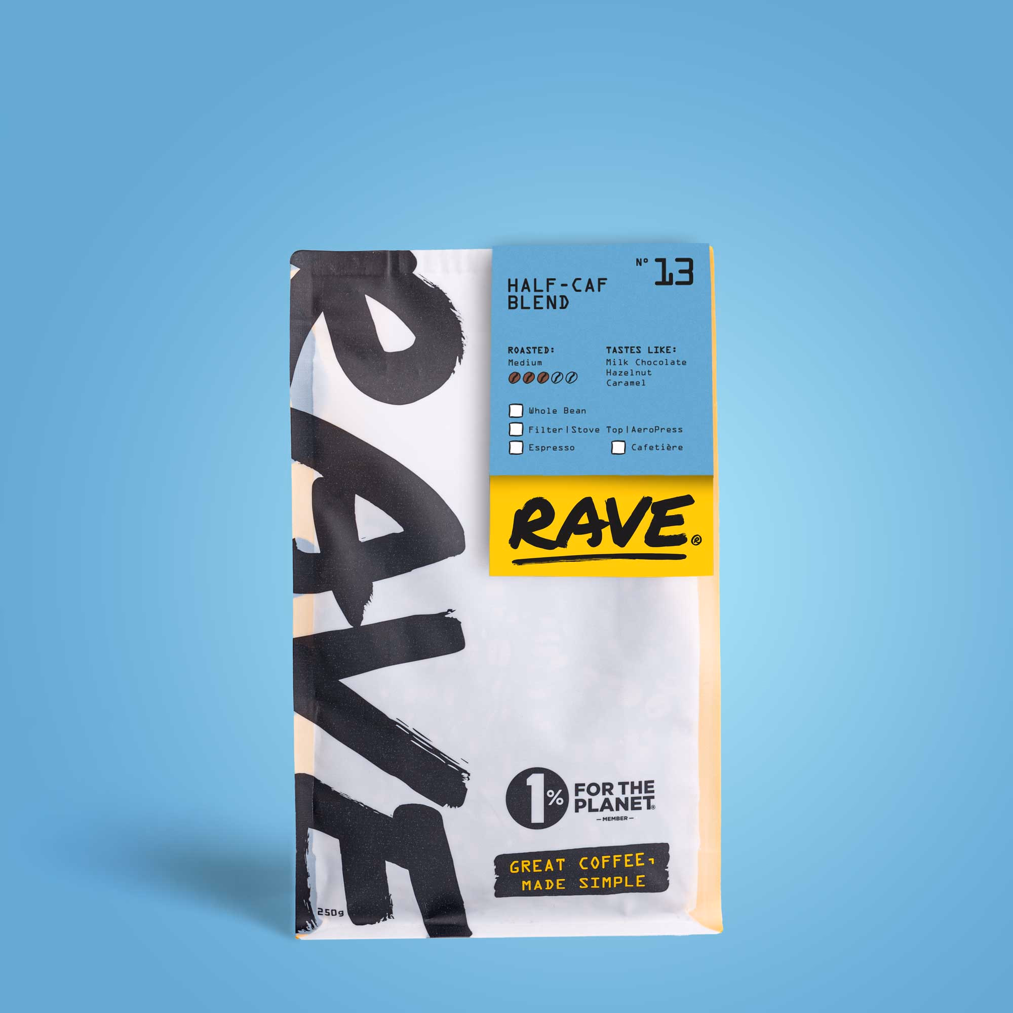 Our Half-Caf Blend is a 50/50 split of caffeinated & decaffeinated beans. This medium roast coffee will bring bags of flavour & character while turning the dial down on caffeine without diving straight into decaf; these beans can keep the coffee game strong all day long. Expect tasting notes of milk chocolate, hazelnut and caramel.