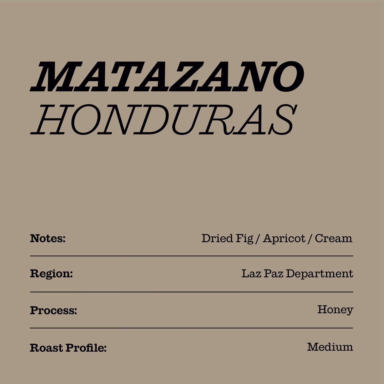 This exceptional coffee comes from Finca El Matazano in the highlands of Honduras at 1,450 m.a.s.l., a 5-hectare farm shaded by diverse timber and fruit trees and home to 21,000 carefully tended coffee plants. The Honey process begins with 36 hours of fermentation in cherry, followed by 10 days of drying on raised beds, developing sweetness, clarity and complexity in the cup.