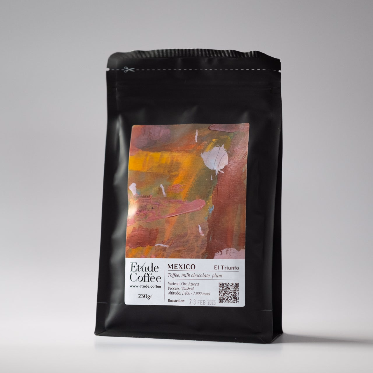 The label's abstract artwork is hand-painted, reflecting the flavour profile and layered complexity of the coffee.