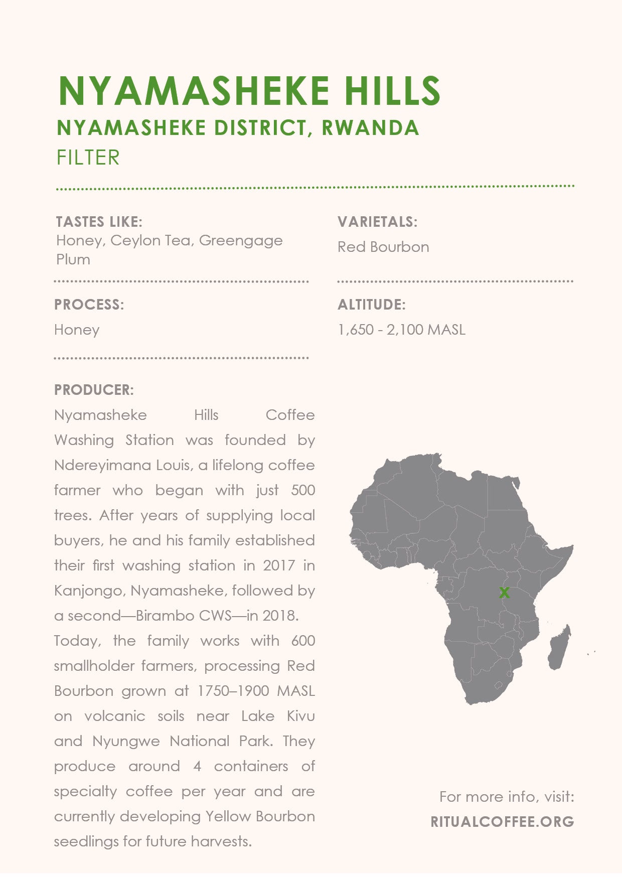 Sourced from 600 smallholder farmers in Nyamasheke and processed at the family‑run Nyamasheke Hills coffee washing station, this lot reflects the region’s rich volcanic soil and high‑altitude terroir. The station’s meticulous, fully‑washed process, from hand‑sorting to slow drying on raised beds, ensures exceptional clarity and sweetness.