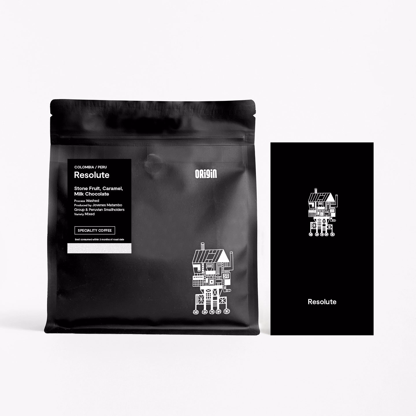 Resolute is our flagship espresso blend, sourced for a timeless, balanced and full-bodied profile with quality at the forefront and community at its core. The components this season are from young producers in Colombia and smallholder lots from Peru.