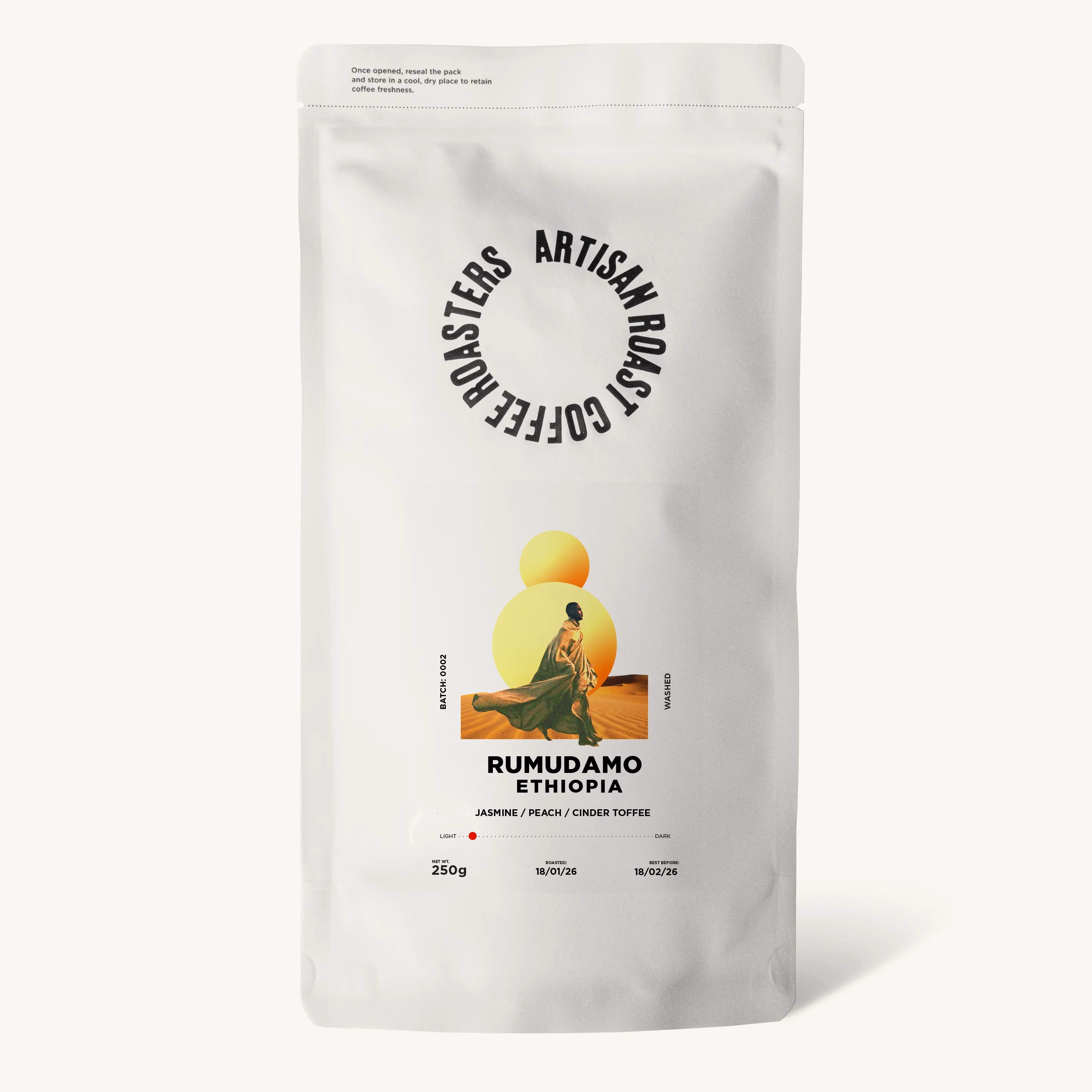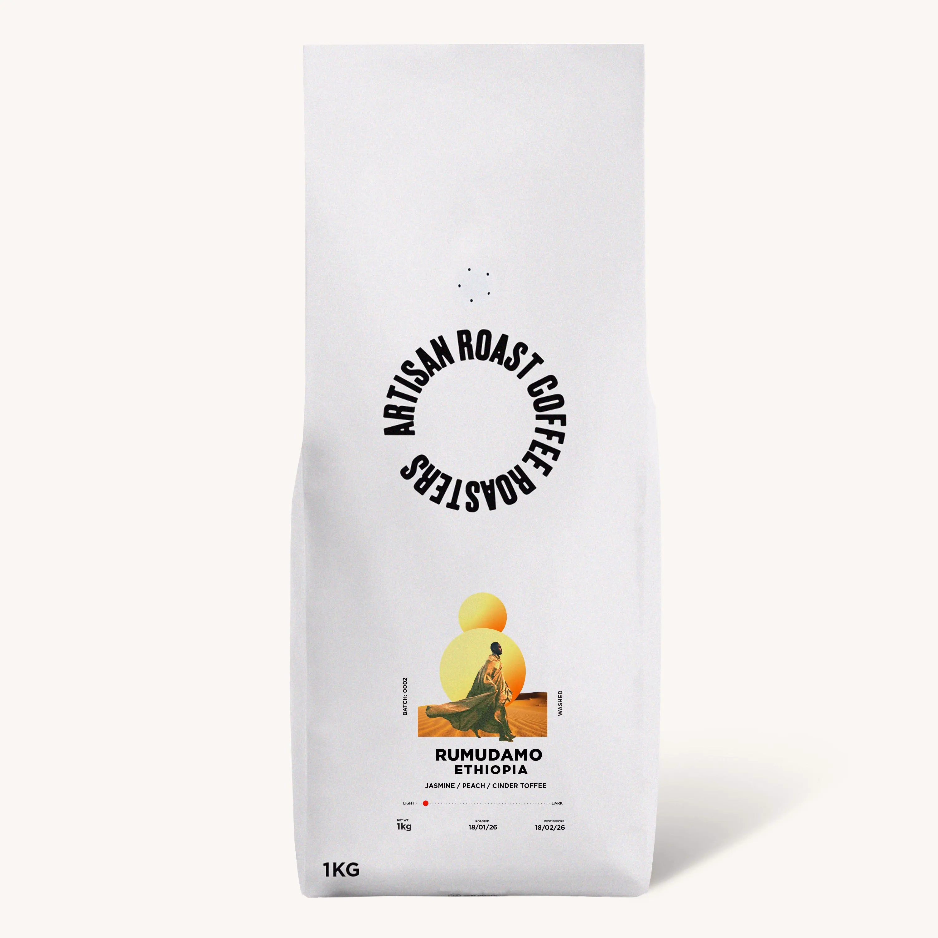 A supremely elegant micro-lot from Sidama. Heady jasmine and peach combine with juicy clementine over a full caramel base.