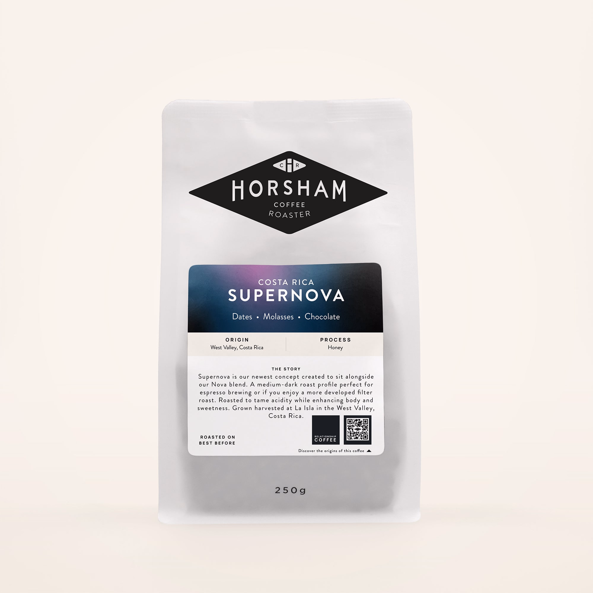 Supernova is our newest concept created to sit alongside our Nova blend. A medium-dark roast profile perfect for espresso brewing or if you enjoy a more well developed filter roast. Roasted to tame acidity while enhancing body and sweetness. We feature a range of different washed and honey processed coffees through the year.